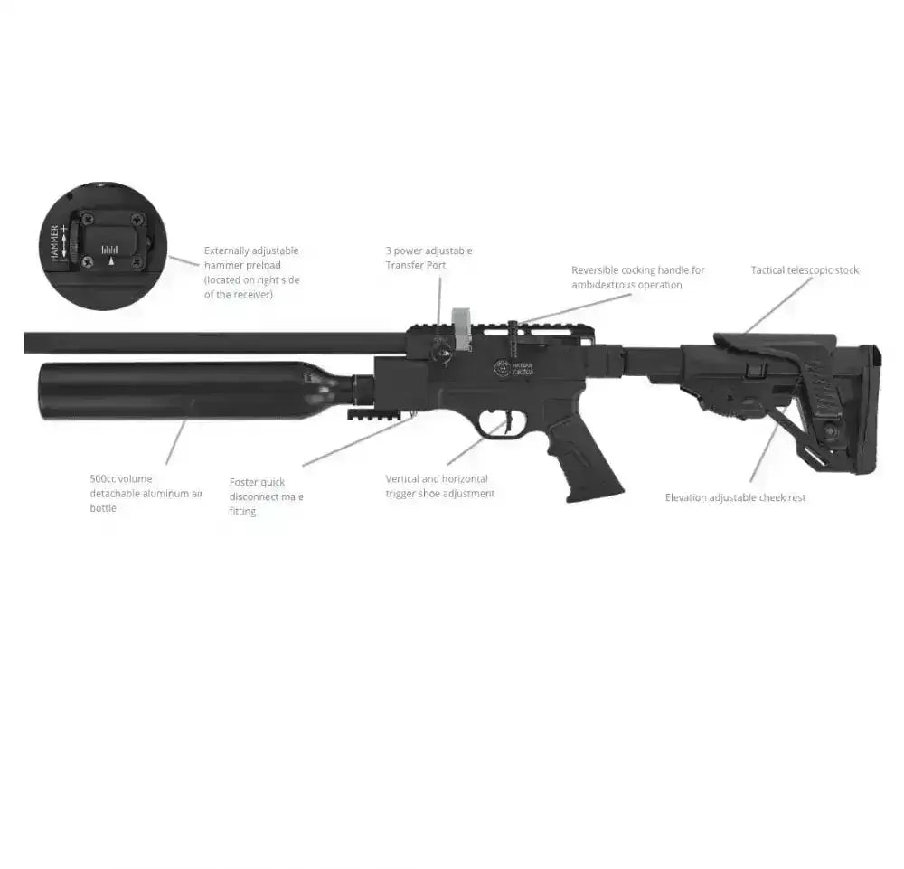 Both the hammer and transfer port can be adjusted so you can change the muzzle velocity. This allows you to customize the rifle according to the ammunition and distance so that you can land very precise shots. The trigger is a quattro 2-stage adjustable trigger, the trigger can also be adjusted in height and angle.
