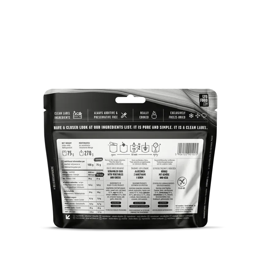 LYOFOOD Mexican Scrambled Eggs – Breakfast with eggs and vegetables A flavorful and protein-rich start to the day LYOFOOD Mexican Scrambled Eggs is a warm and satisfying breakfast with spicy vegetables, egg mixture, and cheese. Inspired by Mexican flavors and made with 100% natural ingredients. The dish is free from preservatives and artificial additives, and is perfect for mountain hikes, expeditions, and camping – when you need a good and quick start to the day.