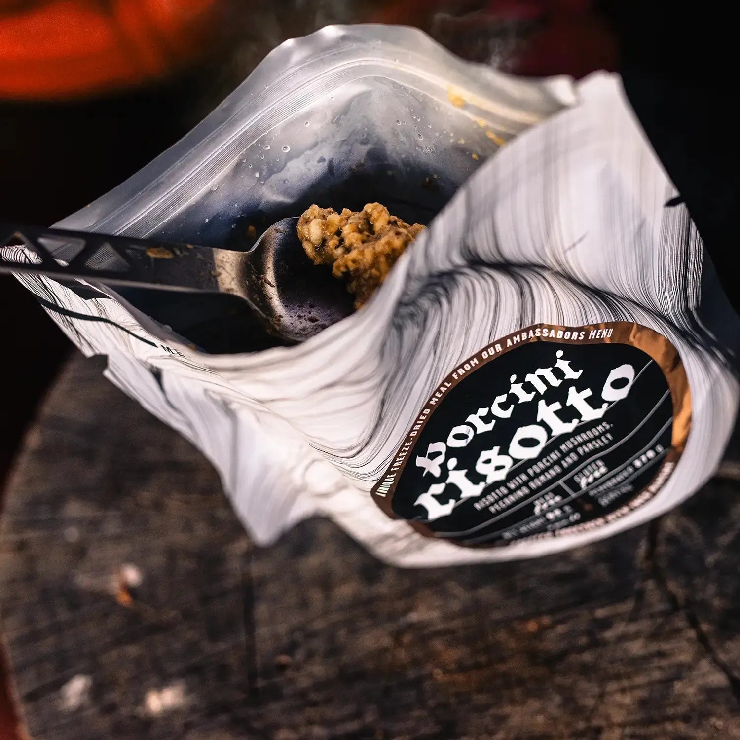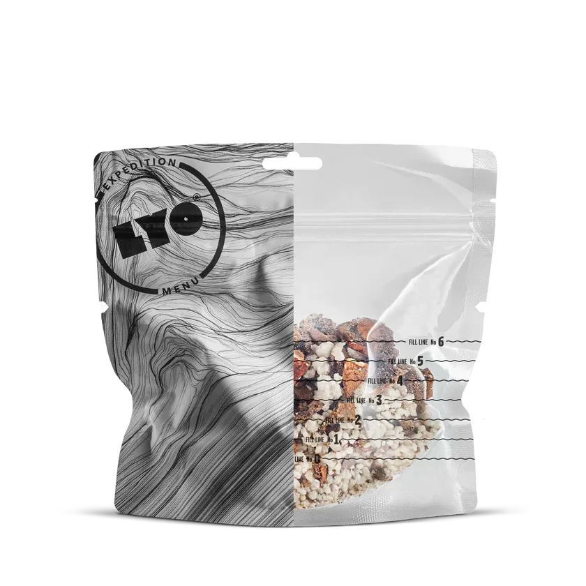 LYOFOOD Porcini Risotto is a creamy outdoor meal with rice and porcini mushrooms. It contains butter, cream, onions, and garlic, and is flavored with herbs and a splash of white wine to enhance the natural mushroom taste. The dish is made with 100% natural ingredients – no artificial additives – and is perfect for hiking, camping, or as a warm dinner on cold evenings in the field.