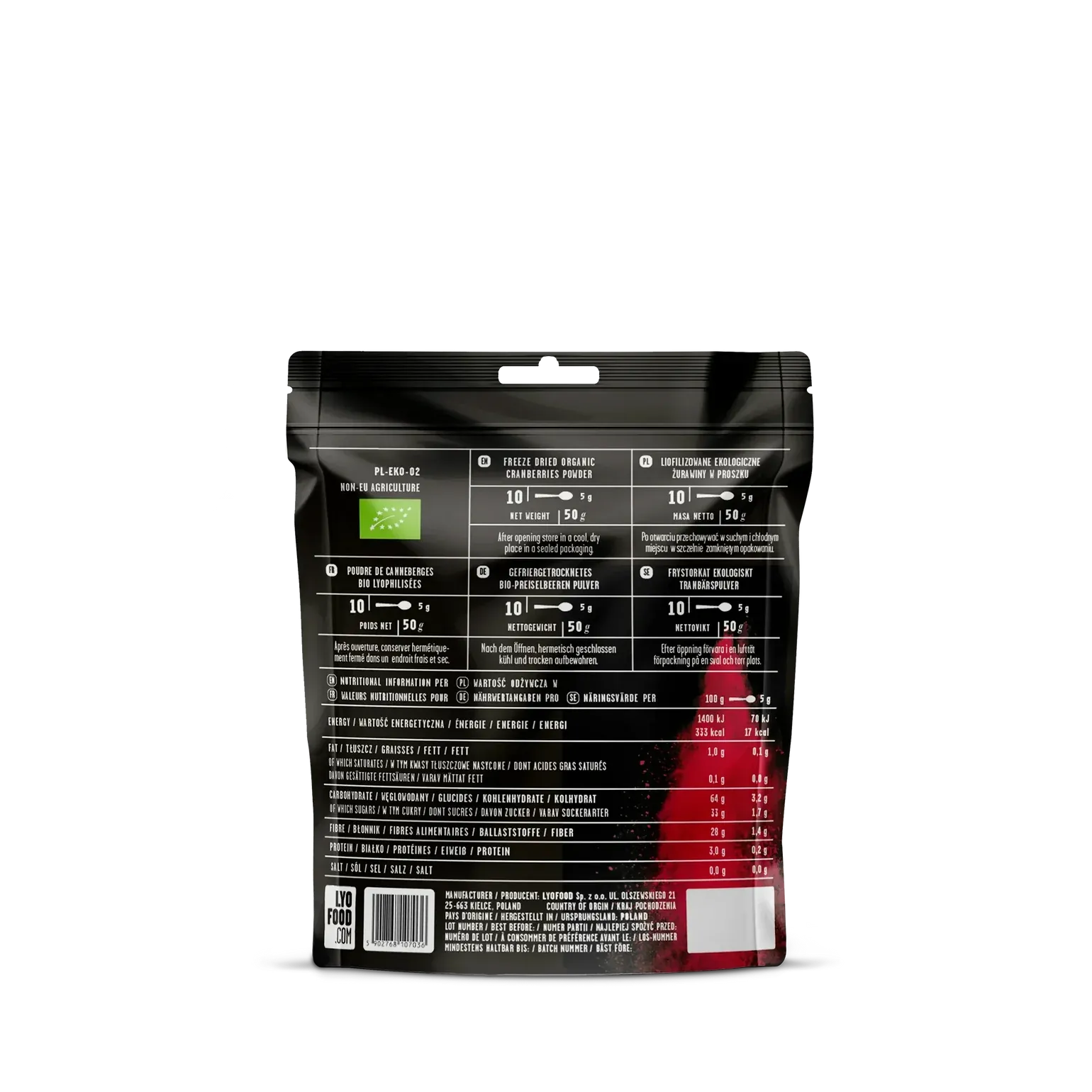 Specifications Weight (net) 50g Origin Poland Ingredient Organic cranberries (100%) Shelf Life Up to 2.5 years Benefits 100% organic cranberries – no artificial additives Rich in vitamin C and antioxidants Perfect for smoothies, porridge, and baking Lightweight and long shelf life Nutritional Content (per 100g powder) Energy: 1420kJ / 339kcal Fat: 1.5g (of which saturated fat: 0.1g) Carbohydrates: 68g (of which sugars: 32g) Fiber: 16g Protein: 6g Salt: 0.02g Ingredients Organic cranberries (100%)