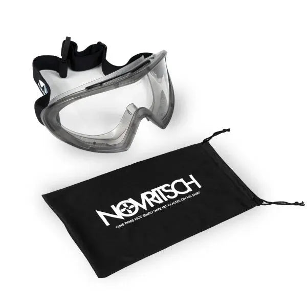 To preserve lens clarity and avoid damage, clean only with the provided microfiber cloth. Avoid using alcohol or other solvents, as these can damage the plastic lens. Store the glasses in a dry place and avoid humid environments to prevent deterioration of the anti-fog treatment.