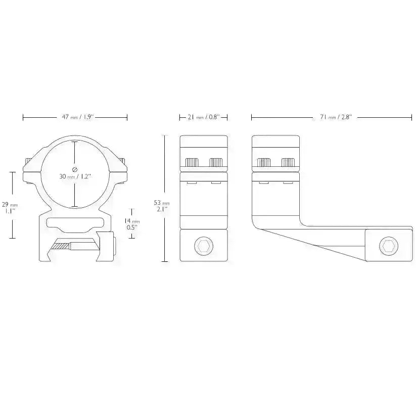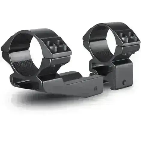 Aluminum mountings with an anodized black surface. The mounting rings have a soft and fine coating on the inside that keeps the optics firmly in place and prevents the optics from being scratched. The mounting rings are high to make room for wider optics and fit well with slightly larger binoculars.