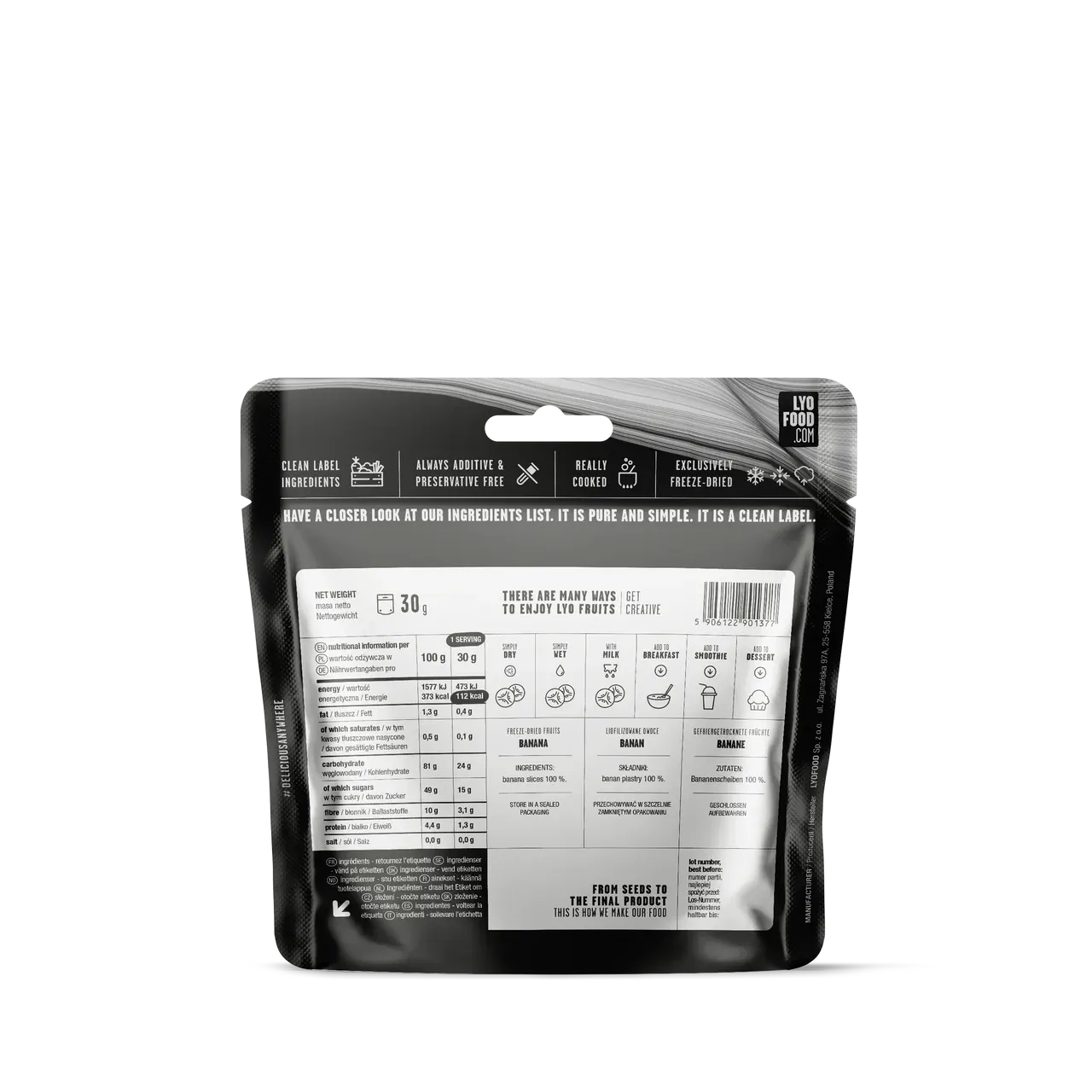 These freeze-dried banana slices from LYOFOOD are made from pure banana – no added sugar, no oils, no preservatives. A fantastic alternative to fried or added dried fruit. They taste naturally sweet, provide energy, and stay crispy for a long time. Ideal for hiking, sports, everyday treats, or as a topping in breakfast and dessert.Benefits