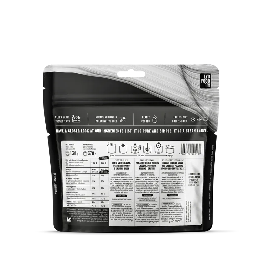 Specifications Weight (net) 90g Prepared weight 370g Servings 1 adult serving Shelf life Up to 5 years Benefits 100% natural ingredients – no artificial additives Cheese pasta made with real cheese, milk, and butter Ready in 10 minutes – just add boiling water Long shelf life and low weight – ideal for hiking and emergency preparedness Nutritional content (per 100g dry product) Energy: 1827kJ / 436kcal Fat: 18g (of which saturated fat: 12g) Carbohydrates: 47g (of which sugars: 4g) Fiber: 3.2g Protein: 17g Salt: 2.3g Ingredients