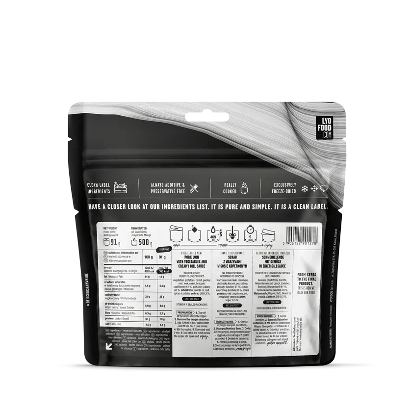 LYOFOOD Pork Loin in Dill Sauce is a flavorful dinner with pork and potatoes in a mild, spicy dill sauce. The dish contains 100% natural ingredients – no artificial additives – and is lactose-free. It offers a rich and satisfying experience, perfect for hiking, expeditions, or field use where you need good food with low weight and high durability.