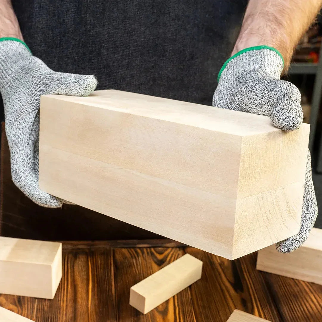 Blokken er laget av naturlig lindetre uten sprekker, noe som gir en behagelig skjæreopplevelse uten overraskelser. Materialets fleksibilitet og styrke gjør det enkelt å forme selv intrikate detaljer. Ulikheter i treverket og årringer kan forekomme og gir treverket et unikt og personlig preg.
