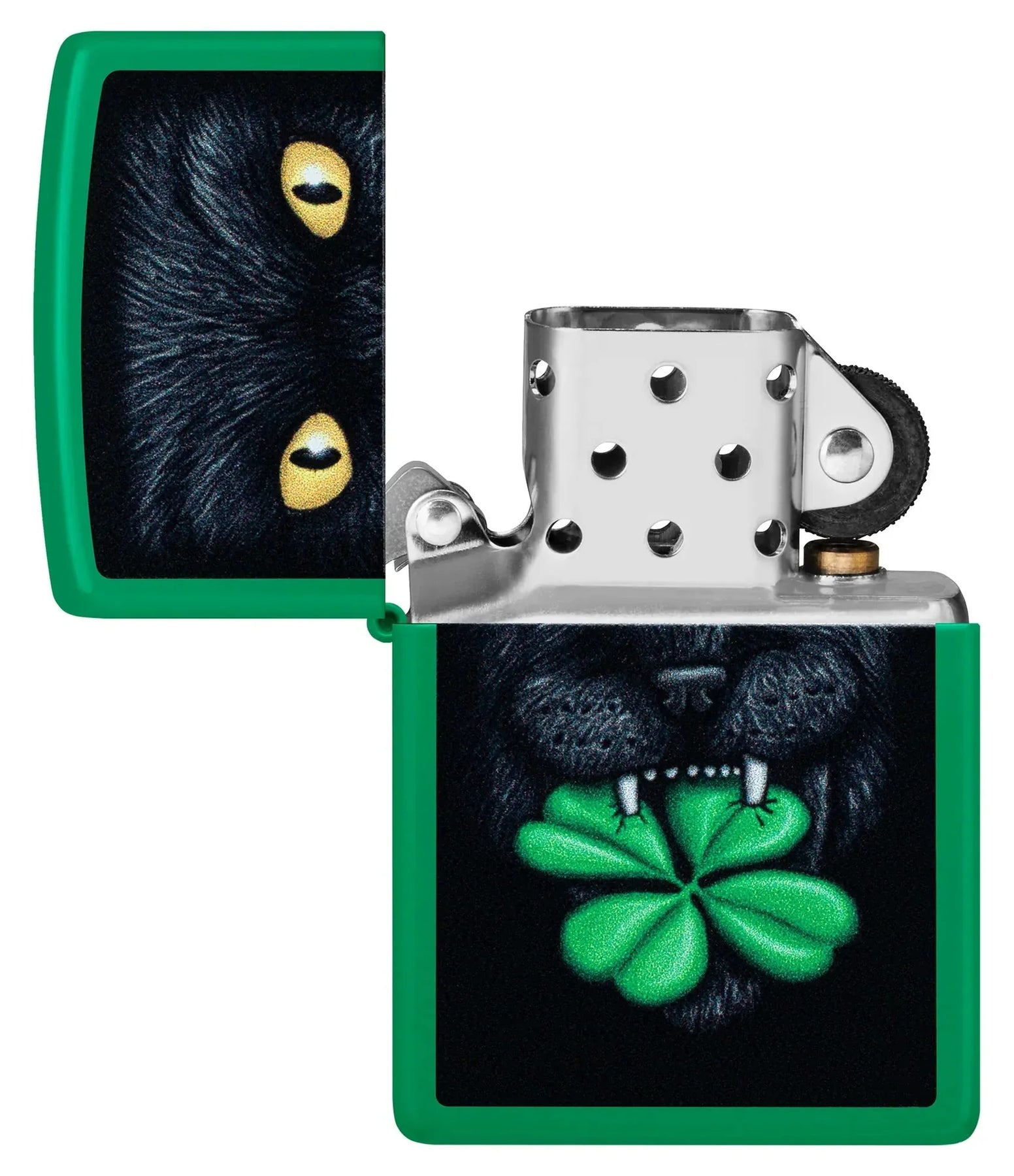 Legg til et snev av flaks i hverdagen med Zippo Feline Lucky Design. Denne klassiske Zippo-lighteren har en livlig grønn matt finish og et fargerikt motiv av en svart katt som holder en firkløver i munnen – et symbol på hell og beskyttelse mot uflaks.